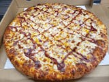 Chicken, onions and extra cheese on a layer of BBQ sauce.